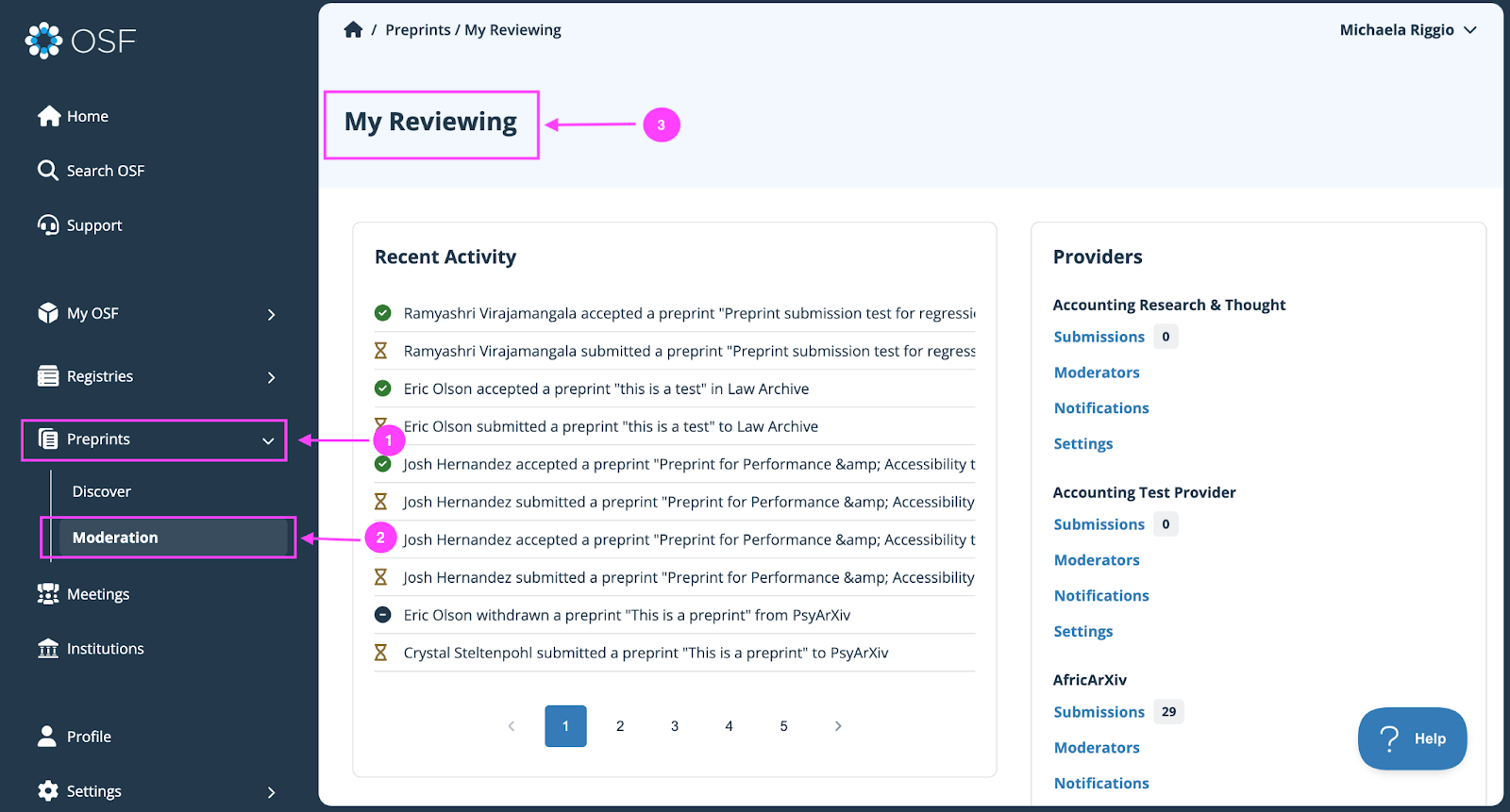 - This will take you to the “My Reviewing” moderation dashboard, you can also access this dashboard via https://osf.io/preprints/my-reviewing .
