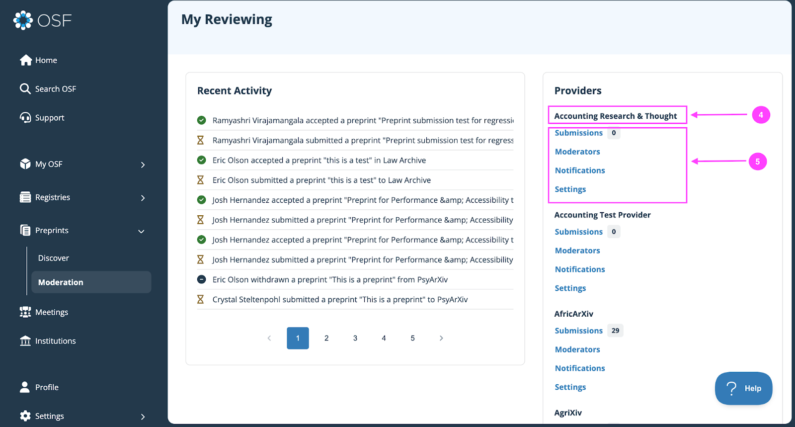 - Under “Providers”, you can see in the moderator dashboard each of the preprint services that you moderate. There are links to the features (Submissions, Moderators, Notifications, Settings) within each service under the preprint service name.