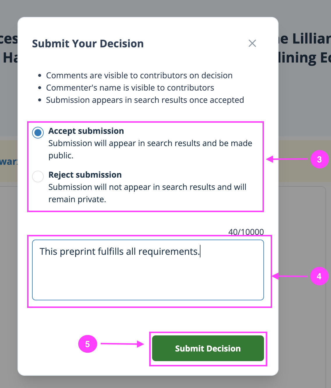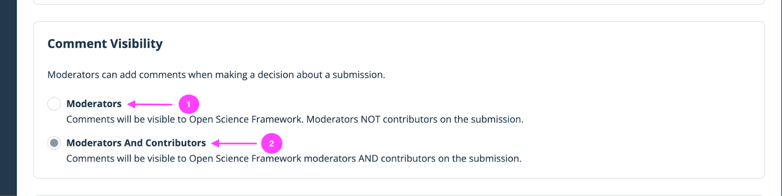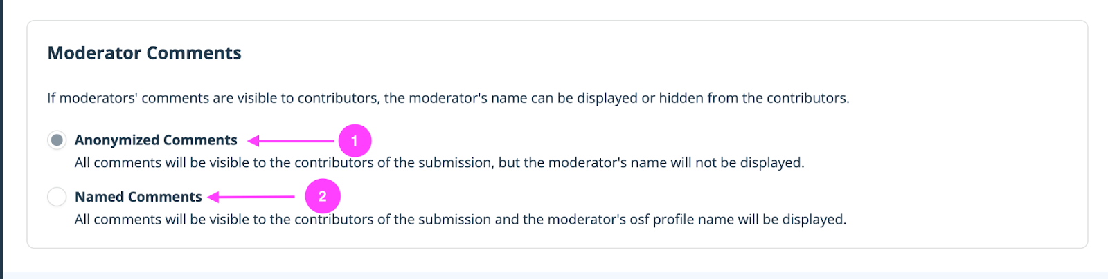- Named Comments - All comments will be visible to the contributors of the submission and the moderator's OSF profile name will be displayed.