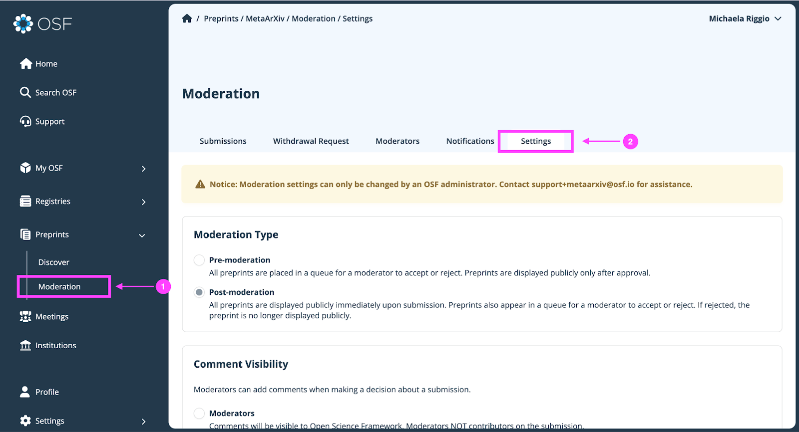 For new OSF Preprint members, several moderation options will be configured by an administrator. 1. You can check these configurations by going to your “Moderation” page.