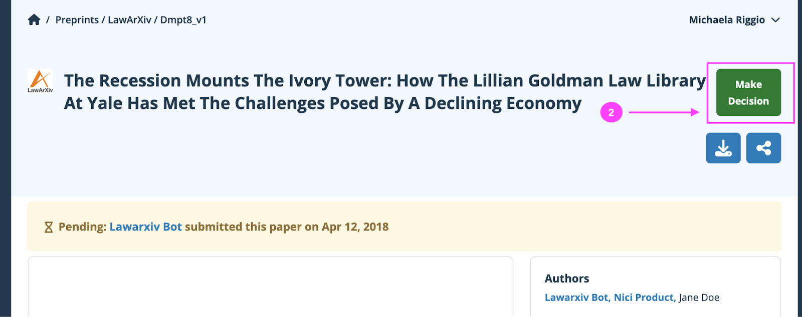- Navigate to the “Pending” submission tab and select the submitted preprint or preprint version that you would like to moderate.
