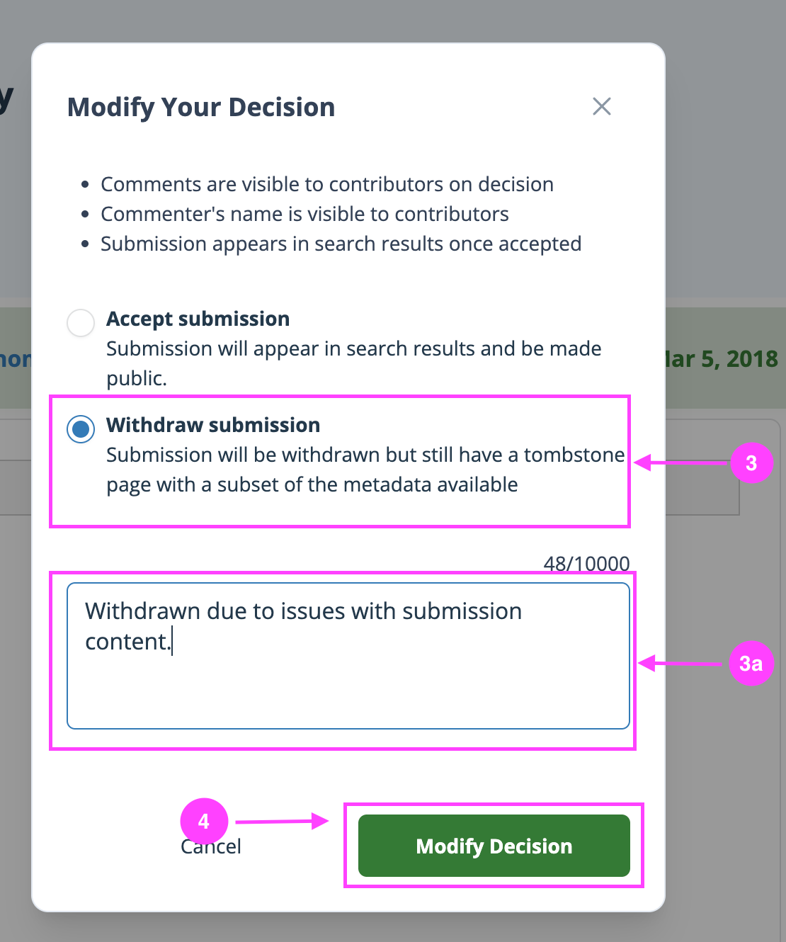 - Select “Withdraw submission” and include comments for the contributors. This can refer to a reason for withdrawal.