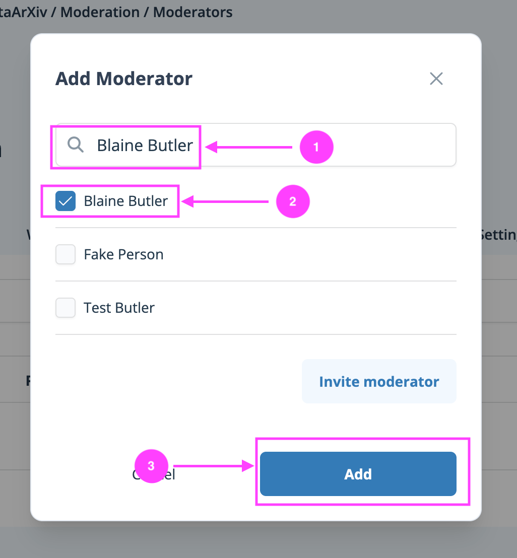 Then, a pop-up will appear where you can add new moderators in two ways: