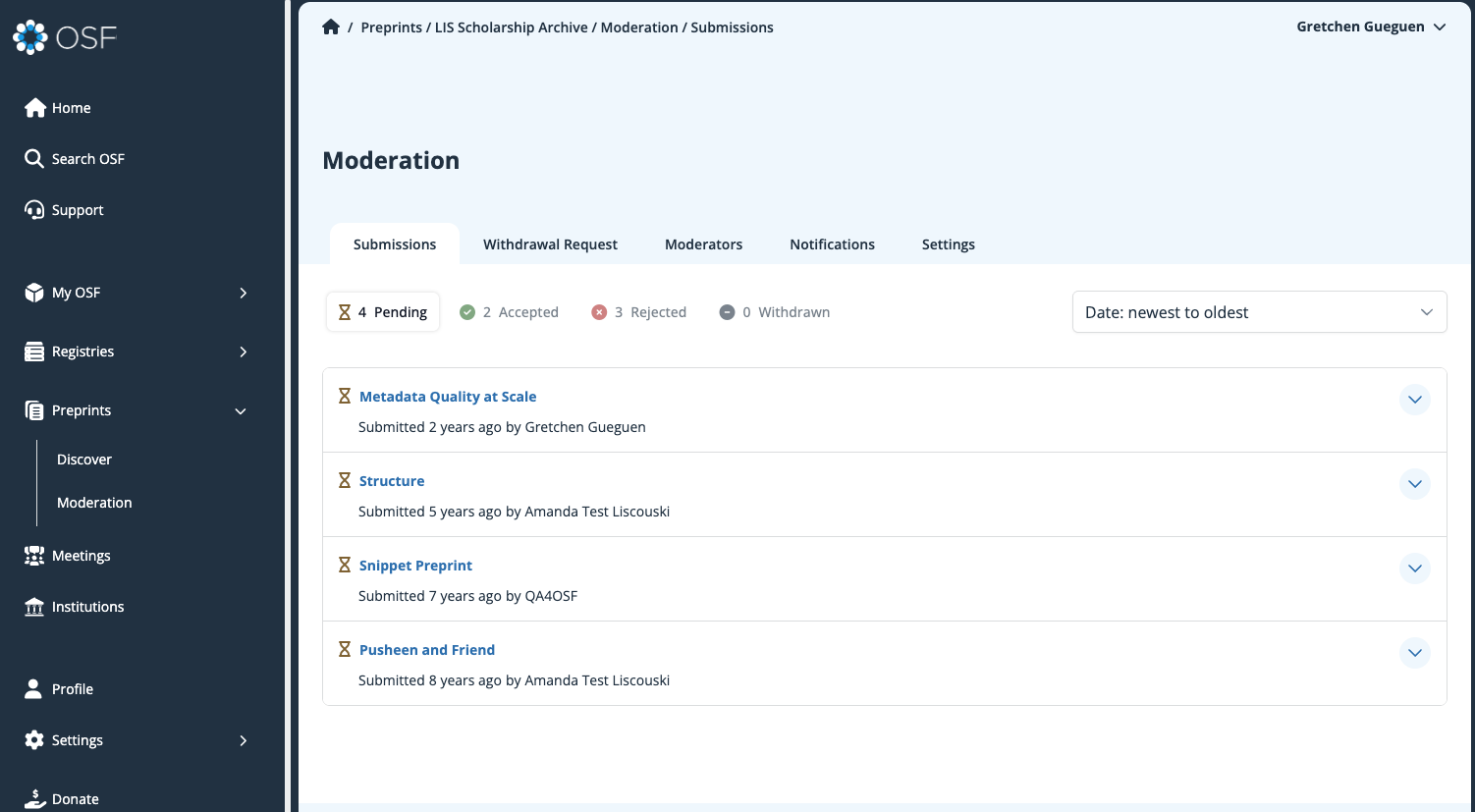 Moderators can follow the status of content submitted to the service within each OSF Preprints Member Dashboard. Each dashboard includes several tabs.