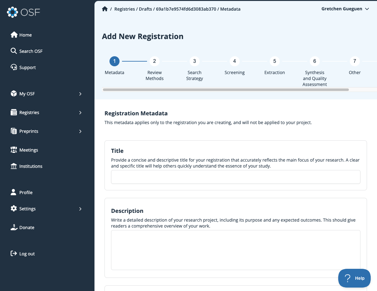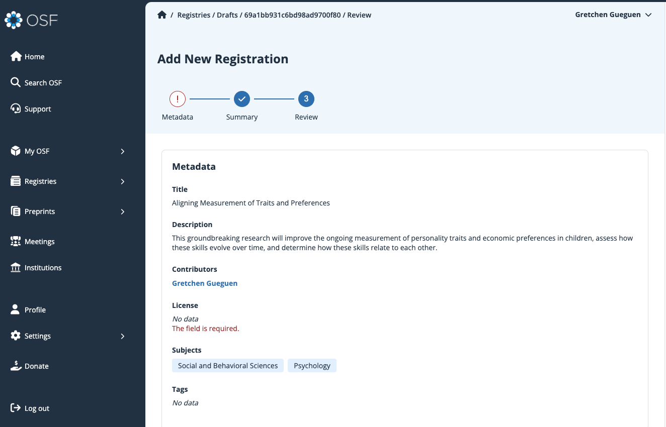 Some supplementary metadata can also be added to registrations after they are created. This includes funder information and language. See this help guide to find out more about adding this supplemental metadata.