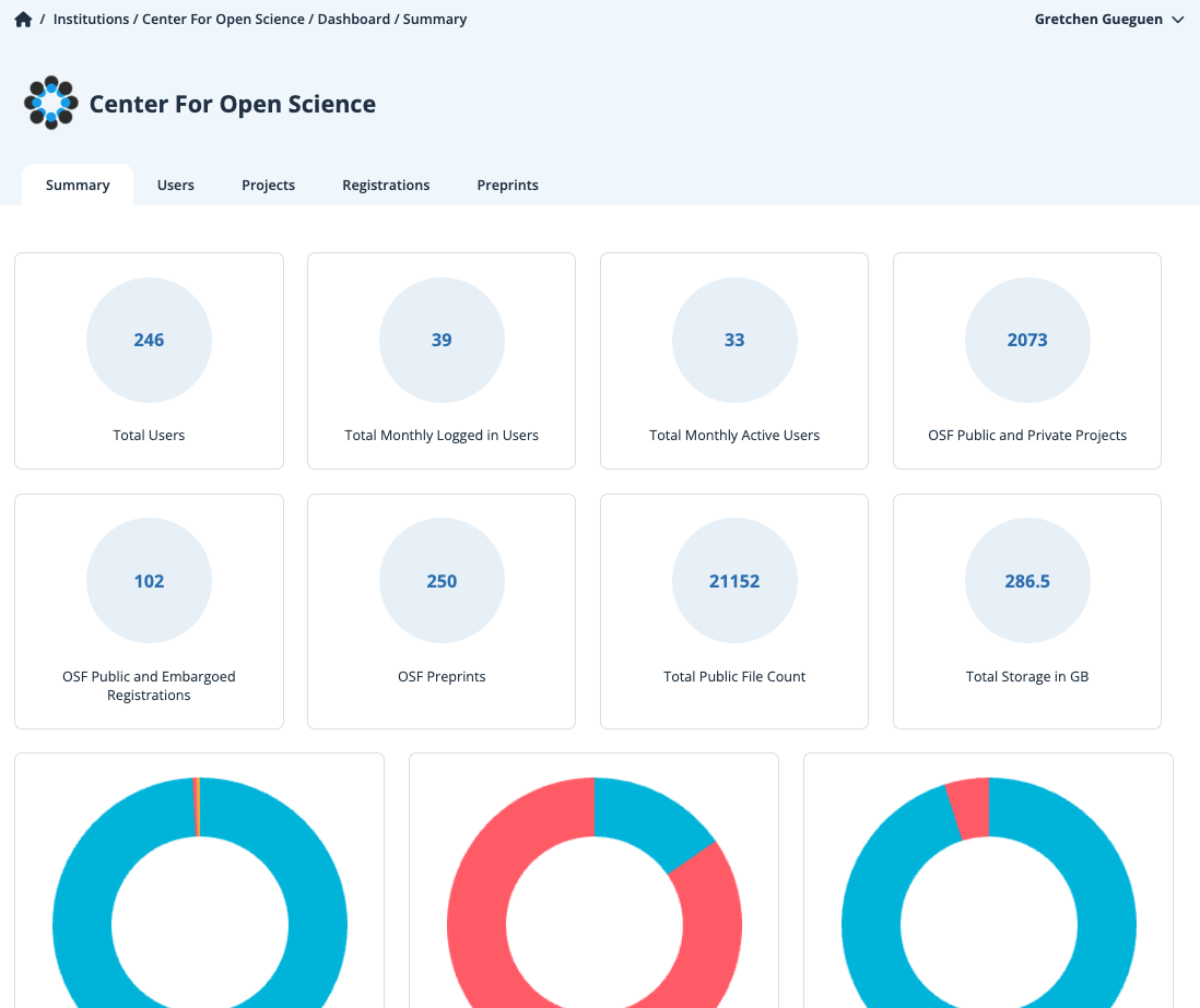 The metrics dashboard for each institution can be found by adding "/dashboard" to the end of the institution's home page URL (e.g. osf.io/institutions/cos becomes osf.io/institutions/cos/dashboard ) . Administrators will be able to see the dashboard for their institution if they are logged into OSF. No other login is necessary.
